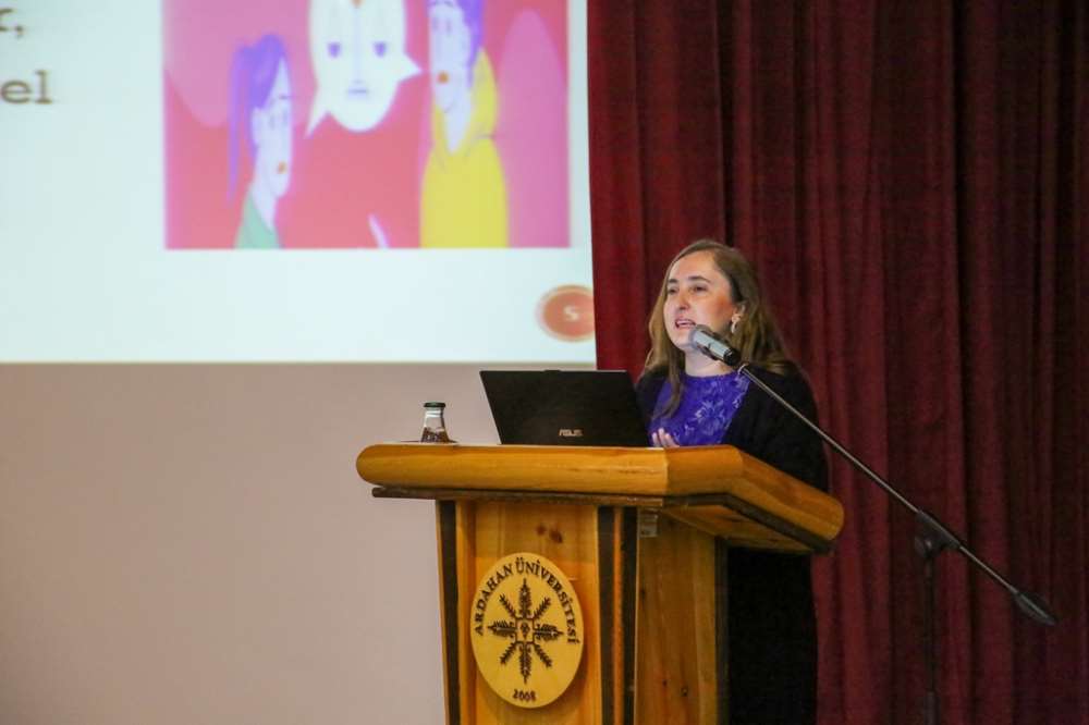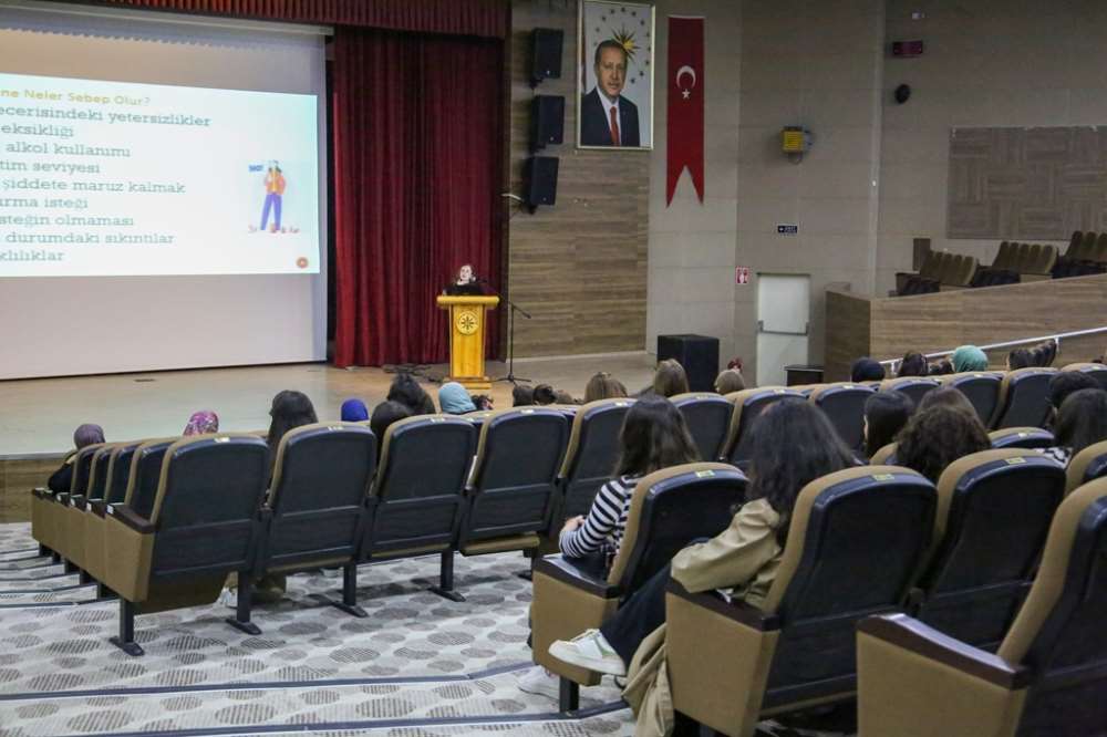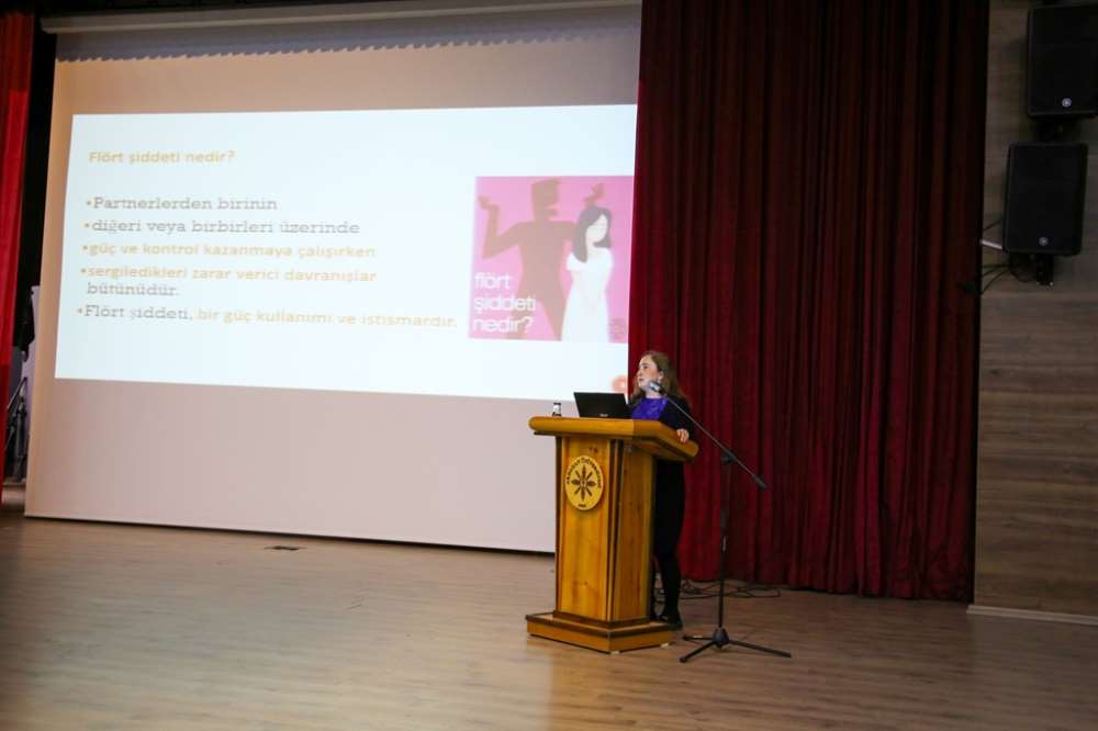 Üniversitemiz Kadın ve Aile Araştırmaları Uygulama ve Araştırma Merkezi tarafından “Üniversite Öğrencilerinde Flört Şiddeti ve Siber Şiddet Hakkında Farkındalık Oluşturma” konulu bir seminer düzenlendi. Seminere konuşmacı olarak Merkez Müdürü Doç. Dr. Bahanur Malak Akgün katıldı. Doç. Dr. Akgün, seminerde flört şiddeti ve siber zorbalık kavramlarını ele alarak, bu tür şiddet biçimlerinin bireyler üzerindeki olumsuz etkilerine dikkat çekti. Flört şiddetine neden olan faktörler, şiddetin türleri, gerçekleşme biçimleri ve belirtileri hakkında ayrıntılı bilgiler paylaşıldı. Ayrıca flört şiddeti ve siber zorbalığın psikolojik, sosyal ve hukuki sonuçları üzerinde durularak, bu tür şiddet davranışlarının önlenmesine yönelik farkındalık oluşturulması hedeflendi. Etkinlikte, öğrencilerin konuya ilişkin farkındalık düzeylerinin artırılması ve olası durumlarda nasıl hareket edebilecekleri konusunda bilgilendirilmeleri amaçlandı. Katılımcı öğrenciler, seminer sonunda Doç. Dr. Akgün’e sorular yönelterek görüş alışverişinde bulundular.