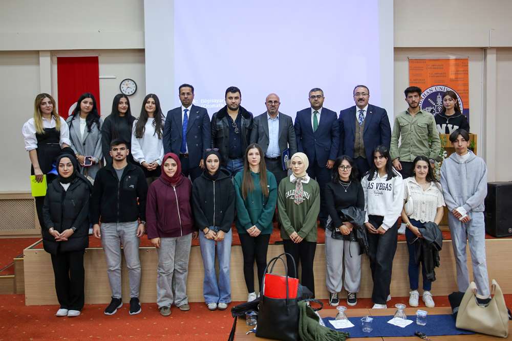 Üniversitemiz İktisadi ve İdari Bilimler Fakültesi (İİBF), “Akademik Söyleşiler” programı kapsamında önemli bir etkinliğe ev sahipliği yaptı. Şehit Mustafa Kerimov Konferans Salonu’nda düzenlenen konferansta, "KPSS-A ve Kamuda Kariyer İmkanları" konusu ele alındı. Konferansa konuşmacı olarak Atatürk Üniversitesi Araştırma Hastanesi Müdürü ve Gelir Uzmanı Fedli Dumlu ile İstanbul Kariyer Erzurum Koordinatörü Zafer Uzar katıldı. Uzman isimler, öğrencilere KPSS-A grubu sınavlarının içeriği, sınav süreci ve kamuda kariyer yapma yolları hakkında kapsamlı bilgiler verdi. Programa İİBF Dekanı Prof. Dr. Ali Kemal Çelik, Dekan Yardımcısı Doç. Dr. Tayfun Yıldız, fakülte akademisyenleri ve çok sayıda öğrenci katılım sağladı. Konferans, öğrencilerin aktif katılım gösterdiği soru-cevap oturumuyla devam etti. Etkinlik sonunda, katkılarından dolayı Fedli Dumlu ve Zafer Uzar’a İİBF Dekanı Prof. Dr. Ali Kemal Çelik tarafından teşekkür belgesi takdim edildi. Program, toplu fotoğraf çekiminin ardından sona erdi.
