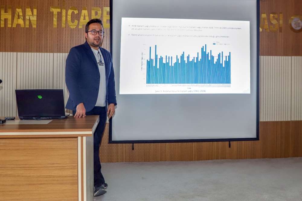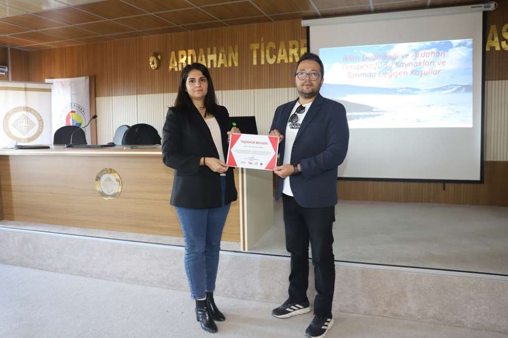 Yükseköğretim Kurulu Başkanlığı tarafından yürütülen Bilim İletişimi Ofisi projesi kapsamında düzenlenen bilim kafe etkinliklerinin 2.’si Ardahan Ticaret ve Sanayi Odası Toplantı Salonunda gerçekleştirildi. Etkinliğin teması “Küresel İklim Değişikliği” oldu. Etkinlikte konuşmacı olarak Üniversitemiz Coğrafya Bölümü Öğretim Üyesi Ferhat Keserci yer aldı. Toplumun farklı kesimlerini bilimsel bilgiyle buluşturmayı amaçlayan etkinliğe, öğrenciler, akademisyenler, kamu kurumlarında görev yapanlar ve yerel halk katılım sağladı. Etkinliğin temel amacı; dünya genelinde yaşanan küresel iklim değişikliğine dikkat çekmek, artan sıcaklıkların çevresel etkilerini değerlendirmek ve Ardahan özelinde gelecekte yaşanması öngörülen sıcaklık artışları ile su taşkınları hakkında farkındalık oluşturmaktı. Sunumda, iklim değişikliğinin tarım ve su kaynakları üzerindeki etkilerine, gelecekte yaşanması muhtemel su krizlerine dikkat çekildi. Keserci, iklim değişikliğinin Ardahan’daki su rejimini önemli ölçüde değiştirebileceğini belirtirken taşkınlara karşı gerekli önlemlerin bugünden planlanmasının kritik önem taşıdığını vurguladı. Programın sonunda gerçekleştirilen soru-cevap bölümünde katılımcılar, su yönetimi, tarımsal adaptasyon ve yerel ölçekte alınabilecek önlemler hakkında sorular sordu. Etkinlik teşekkür belgesi takdimi ve toplu fotoğraf çekimi ile sona erdi.