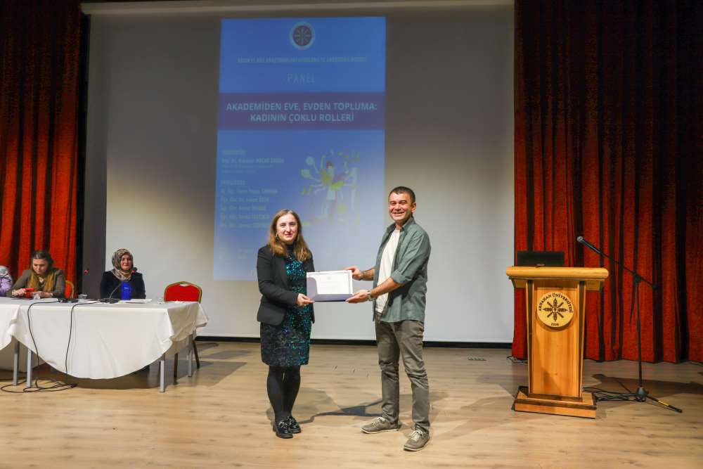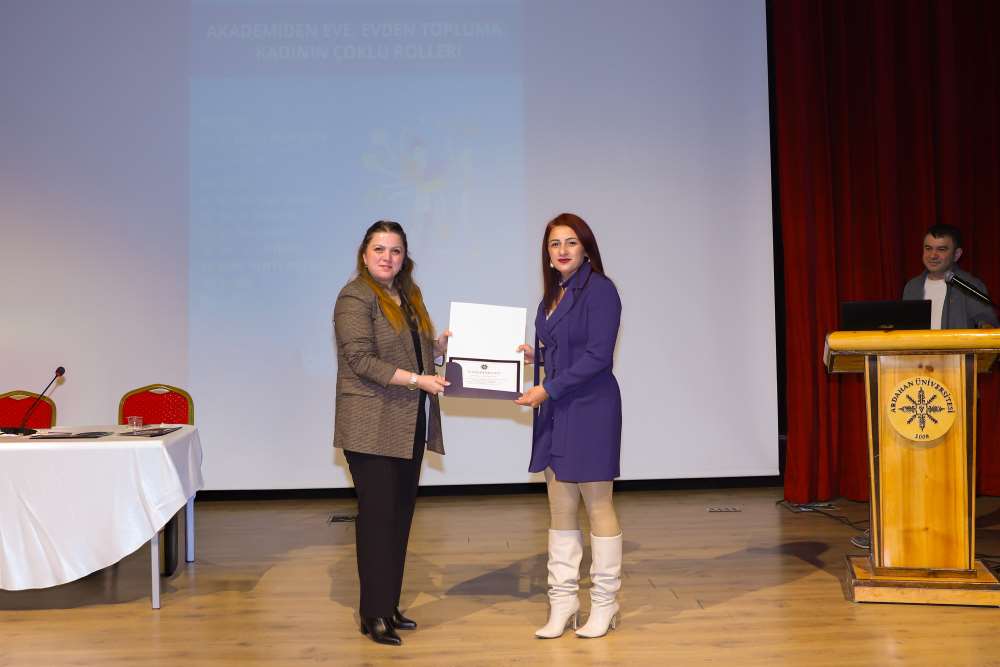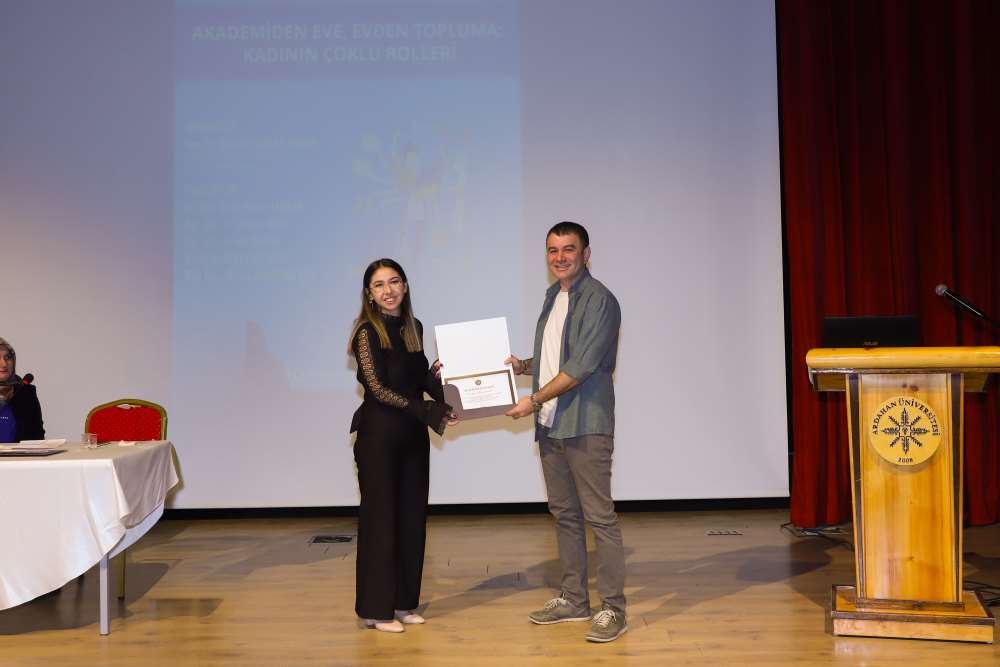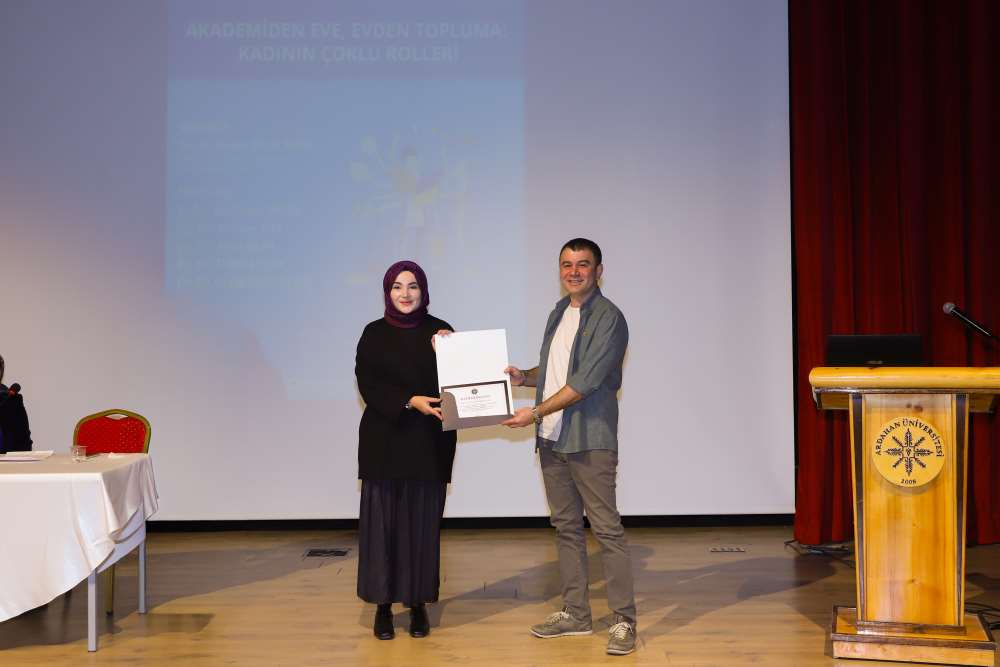 Türkiye Yüzyılı Aile Yılı, Kadının Güçlenmesi Strateji Belgesi ve Eylem Planı ile Kadına Yönelik Şiddetle Mücadele Eylem Planı kapsamında, Üniversitemiz Kadın ve Aile Araştırmaları Uygulama ve Araştırma Merkezi tarafından “Akademiden Eve, Evden Topluma: Kadının Çoklu Rolleri” başlıklı bir panel düzenlendi. 27 Ekim 2025 tarihinde Aşık Şenlik Kültür Merkezi’nde gerçekleştirilen panelin moderatörlüğünü Kadın ve Aile Araştırmaları Uygulama ve Araştırma Merkezi Müdürü Doç. Dr. Bahanur Malak Akgün üstlendi. Etkinlikte Dr. Öğr. Üyesi Yeşim Tarhan, Öğr. Gör. Dr. Emine Özen, Öğr. Gör. Nimet İnkaya, Öğr. Gör. Sevda Taştekin ve Arş. Gör. Zeynep Demirtaş Atış panelist olarak yer aldı. Katılımcılar, kadının akademide, ailede ve toplumda üstlendiği çoklu roller, bu roller arasındaki sınırların belirsizliği, zaman zaman yaşanan rol çatışmaları ve bu durumun kadının yaşam kalitesi ile akademik başarısına etkileri üzerine değerlendirmelerde bulundular. Kadının hem bilimsel üretimde hem de aile ve toplum içinde denge kurma mücadelesinin önemine vurgu yapılan panelde, çoklu rollerin görünür kılınmasının toplumsal bir sorumluluk olduğu ifade edildi. Program, Ardahan Üniversitesi akademisyenleri Dr. Öğr. Üyesi İzzet Özhamamcı ve Öğr. Gör. Dr. Raziye Filiz Akkuş’un moderatör ve panelistlere katılım belgelerini takdim etmeleriyle sona erdi.